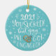 Celebra tu compromiso con este divertido y moderno ornamento de cerámica. En la parte delantera hay una leyenda a la moda, con letras a mano, que dice "¡2021 has chupado! ¡Pero sí, nos comprometimos!" con letras blancas sobre un fondo azul claro, y está decorado con copos de nieve y un ilustracion de dos anillos de compromiso. La parte de atrás está personalizable con tu foto favorita de compromiso con la leyenda "Nuestra primera Navidad comprometida". Por favor, no dude en contactarme en zolicestore@hotmail.com para cualquier personalización o combinación de colores.