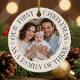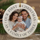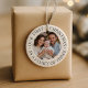 Moderno ornamento blanco redondo de cerámica con arco NUESTRA PRIMERA NAVIDAD y curvo como FAMILIA DE TRES tipografías. Un círculo suave de pinceladas encuadra la foto de tu familia, y el año dividido se sienta bien a los lados. Limpio, atemporal y perfecto para celebrar las primeras vacaciones con el bebé.
