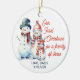 Ornamento navideño por tu primera navidad como familia de tres. El diseño presenta una familia linda de tres hombres de nieve - mamá, papá y bebé - vestidos con gorras y bufandas. La frase dice "Nuestra primera Navidad como familia de tres". Puede personalizar el diseño con sus nombres en la parte delantera y el año posterior.