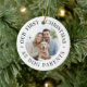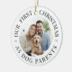 ¡Celebra la primera fiesta con tu cachorro! Este adorno de cerámica blanca redonda presenta el texto de arriba en arco de "NUESTRA PRIMERA NAVIDAD" y "COMO PADRES DE PERRO" debajo, enmarcando una ventana de foto de borde suave para tu retrato favorito de pareja y perro. Los números de año divididos se sientan cuidadosamente en los lados por un diseño limpio y equilibrado. La tipografía en blanco y negro la mantiene moderna y coincide con cualquier árbol o caja de regalo. Suelta tu foto y fija el año para crear un sentido aguijón para los amantes de las mascotas y las nuevas familias de perros.
