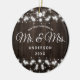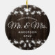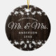 Nuestra Primera Navidad Como Sr. Y Mrs. String Lights Ceramic Ornament. Este diseño presenta un fondo rústico de madera con luces rústicas de cuerda.