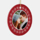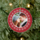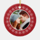 Haz un favor para tu primera Navidad como pareja casada con este adorno que tiene tu foto y tu texto personal. El adorno es rojo y tiene una corona blanca de copos de nieve alrededor de la foto redonda.