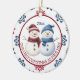 Nuestra primera Navidad siendo casada. Dos lindos hombres de nieve de color rosa y azul rodeados de copos de nieve con adornos navideños personalizados.