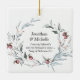 Nuestra Primera Navidad como Mr & Mrs Ornament representa un diseño de flores naturales de color de agua floral con follaje plateado y bayas rojas. La parte trasera muestra los nombres de la novia y el novio y la canción de Verse de la Biblia de Salomón 6:3, "Soy de mis queridos y mi amado es mío..." El verso se puede personalizar según los detalles de su elección.~