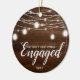 Nuestra Primera Navidad Comprometida. Ornamento cerámico Personalizado de vacaciones. Este diseño presenta un fondo rústico de madera con lámparas de cuerda de tarro de albañil.