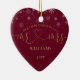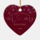 Con una tipografía moderna de escritura de corazón de amor dorado sobre copos de nieve y fondo rojo burdeos, esta moda nuestro primer adorno de conservas de Navidad puede ser personalizado con tu nombre casado, fecha y nombres o iniciales de monograma al revés. Diseñado por Thisisnotme©