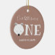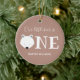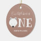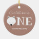 Y nuestro oso pequeño es un adorno de conservas de cumpleaños. El adorno es marrón claro y blanco, con la palabra "Uno" en letras grandes con un ilustracion de cara de oso polar como primera letra de la palabra. Simplemente, personalizar, añádalo a tu carrito y agréguelo a tu árbol. Nuestro Oso Polar Primer Cumpleaños Cerámica Ornamento navideño de Navidad Diseño | ©Melissa Patton - Artista/Ilustrador