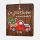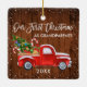 Guión de pincel moderno Nuestra primera Navidad como ornamento de abuelos incluye un camión rojo de color de agua con árbol de navidad, nieve, regalos de Navidad y bastones de caramelo. Impresión rústica de madera de campo. Borde de nieve.