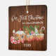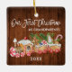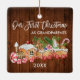 Guión de pincel moderno Nuestra primera Navidad como adorno de abuelos incluye el tren acuarela de pan de jengibre con dulces, galletas y pinos. Impresión rústica de madera de campo.