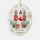 Whimsical The Nutcracker Ballet baby 1st Christmas photo tree ornament. Personalize it with your details easily and quickly, simply press the Edit Using Design Tools button to further re-arrange and format the style and placement of the text. Featuring whimsical characters from the Nutcracker in festive red, green and gold colors. Add your baby's picture at the back of the ornament. Perfect for your little snowflake's first Christmas! Matching items available in store! (c) The Happy Cat Studio.
