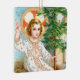 Detalle de una encantadora y vintage imagen del Niño Cristo entregando personalmente un árbol de Navidad iluminado con velas a una casa que se ha preparado para Su llegada. Jesús, sentado sobre su pesebre, lleva una bata blanca decorada con una cruz de oro y estrellas. En el centro de la cruz de Su pecho hay una hoja de quatref que contiene el IHS, uno de varios monogramas griegos para Su nombre. Levanta su mano derecha en bendición y sostiene el árbol de Navidad en posición vertical a su izquierda. Perfecto para Advent! + Crédito de la imagen: Detalle de "Gloria in excelsis Deo", huella devocional en cromolitografía dorada, finales del siglo XIX y principios del siglo XX, editorial original (tal vez alemán) desconocido, de la colección privada de ephemera religiosa del diseñador. + Crédito de la imagen (Atrás): estrellas del oro sobre fondo rojo por rebeccaread vía Pixabay.