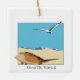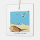Ornamento con un cangrejo herradura bidimensional con imagen de gaviota marina sobrevolando la playa con olas. Personalizable de fecha atrás. Ciudad del Océano, Maryland frente a Baskerville Font