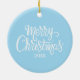 El adorno de cerámica de Navidades personalizados con osos polares lindos con copos de nieve cayendo sobre un fondo azul hielo con el nombre de la familia y el año en un tipo de letra gris clásico. El reverso presenta Feliz Navidad en un guion de letra blanca con el año en un fondo azul hielo coincidente.