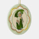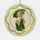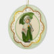 Joven chica irlandesa sosteniendo un paraguas verde y vistiendo una gorra y chal sobre su larga falda verde sobre la capa de guarnecido dorado de vieiras blancas y fondo verde pastel. Este diseño vintage ha sido restaurado a mano.