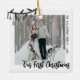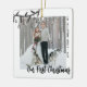 Celebrate the season with this square Christmas ornament featuring “Our First Christmas” on the front for a sweet and memorable touch. The design highlights a large photo accented with a black doodle swag of pine greenery and hanging ornaments in the top left corner, slightly overlapping the image for a casual, hand-drawn look. Your names or family name and the year appear in a simple black handwritten font on the top right for a clean, modern balance.