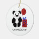 Un lindo oso panda sostiene un globo rojo, un paquete envuelto en rojo con una proa azul a su lado. La palabra "felicitaciones" puede cambiarse como se desee. Un sentimiento dulce para un adorno de oso de cumpleaños.