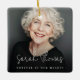 Ornamento conmemorativo de cerámica funeraria con un nombre personalizado y texto de personalizable "para siempre en nuestros corazones" sobre una foto personalizado.