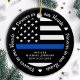 ¡Por Siempre En Nuestro Corazón! Honra a tu amado oficial de policía y con este adorno conmemorativo de la Línea Azul delgada en un diseño azul y negro de bandera estadounidense con los colores de la bandera de la policía. Personaliza con el nombre de tu oficial de policía y la fecha de EOW. Este delgado adorno conmemorativo de la línea azul de la policía será un tesoro para honrar a un oficial caído de la policía o a un oficial de la policía. Perfecto para que los departamentos de policía honren a un oficial caído. DERECHOS RESERVADOS © 2020 Judy Burrows, Black Dog Art - Todos los derechos reservados. Para siempre nuestros corazones delgada Línea Azul Ornamento cerámico conmemorativo