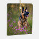 Este adorno presenta una cálida imagen de temporada de un pastor alemán por un lado y una imagen de feriado o Navidad por el otro. ¡Se puede usar todo el año!