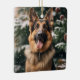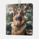 Diseño con un pastor alemán en la nieve, con árboles al fondo