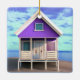 Ornamento en una bonita cabaña de playa/casa de vacaciones sobre pilotes, pintada de blanco y violeta, en la arena, con un cielo azul y nubes blancas