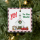 Pequeño camión rojo con la Iglesia del País en la escena invernal con nevada - presentando el original "Pequeño Camión Rojo" de Rick Ellinger de su "Pequeño Camión Rojo de la Aldea del País. Texto: ¡Alegría al mundo!