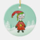 Chica elfo personalizado chistoso con ojos de googly, dos dientes, pelo rubio y trenzas, con un vestido rojo con guarnecido verde y estrella amarilla en la parte delantera. Su gorra a juego se pone con una campana de jingle dorada. Personalizado original de Taylor Addams. Dibujante. Mensch.