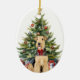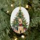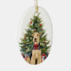 En la parte delantera de este adorno navideño se encuentra la imagen de un hermoso perro Airedale Terrier que lleva un lazo rojo festivo. El perro se sienta frente a un árbol navideño decorado. En la parte posterior, texto rojo y verde dice "FELIZ NAVIDAD", y hay campos de texto adicionales para que puedas personalizar. ¡Haz que diga lo que quieras!