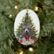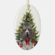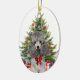 En la parte delantera de este adorno navideño se encuentra la imagen de un adorable perro Caniche Toy Miniatura gris que lleva un lazo rojo festivo. El perro se sienta frente a un árbol navideño decorado. En la parte posterior, texto rojo y verde dice "FELIZ NAVIDAD", y hay campos de texto adicionales para que puedas personalizar. ¡Haz que diga lo que te guste!