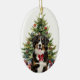 En la parte delantera de este adorno navideño se encuentra la imagen de un hermoso perro de montaña bernés que lleva un lazo rojo festivo. El perro se sienta frente a un árbol navideño decorado. En la parte posterior, el texto rojo y verde dice "FELIZ NAVIDAD", y hay campos de texto adicionales para que puedas personalizar. ¡Haz que diga lo que quieras!
