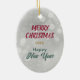 En la parte delantera de este adorno navideño hay una imagen de un perro de Mastiff con un sombrero de Santa y envuelto en luces de Navidad de colores. La imagen está puesta en un fondo festivo de bokeh de plata. La parte posterior del adorno tiene texto en rojo, oro y verde.