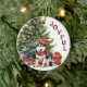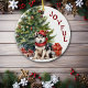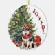 En la parte delantera de este adorno navideño está la imagen de un hermoso perro malamute con un sombrero de Santa y una bufanda rojas y blancas. El perro se sienta frente a un árbol de vacaciones decorado con regalos envueltos de colores alrededor. El texto rojo a un lado dice "JOYFUL". En la parte posterior, el texto rojo y verde dice MERRY CHRISTMAS", y hay campos de texto adicionales para que usted lo personalizar. ¡Haz que diga lo que quieras!