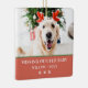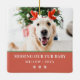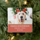 Adorno navideño moderno y elegante con foto personalizada "extrañamos a nuestra bebé de pelaje" con letras serif modernas y huellas de patas superpuestas en un bloque rojo festivo en la parte inferior.