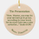 El diseño frontal muestra una reproducción de la famosa pintura del cuarto Misterio alegre, "La presentación del niño Cristo en el templo" del artista Ludovico Carracci en el año 1605." Al revés aparece un verso biblial en el centro justo debajo de las palabras "La presentación". La fase latina, "Nunc Dimittis", se muestra en la parte inferior. El verso de la Biblia es personalizable. Todo el texto está en un verde bosque. Perfecto para cualquier casa católica.