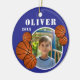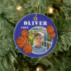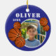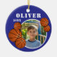 Personalizado Blue Basketball Ball Sports Photo Ceramic Ornament. Ornamento con balones de baloncesto, nombre personalizado y foto en un marco redondo.
