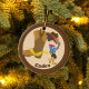 Un adorable adorno navideño personalizado de vaquero que presenta a un niño de una granja apoyado contra una bota gigante de vaquero que tira a su gorra marrón con una estrella amarilla. Un gran regalo de país personalizado con su nombre.