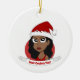 Ornamento navideño con un ilustracion de una hermosa joven afroamericana con cabello ondulado y el gorra de Santa Claus; con plantilla de texto editable, diseño de vacaciones Navidades con fondo rojo