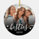 Crea un aguijón personalizado con este adorno navideño personalizado, con un diseño dulce a ambos lados. La parte frontal incluye espacio para una foto favorita con la palabra "besties" escrita en la parte inferior en un tipo de letra de guión fluido, acentuada por pequeños detalles del corazón y la fecha del año. La parte trasera ofrece un espacio limpio para mostrar nombres, lo que la convierte en un regalo personal y significativo. Perfecto para los mejores amigos, hermanos, mascotas o fotos familiares, este adorno es un placer para las vacaciones o cualquier ocasión especial.