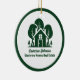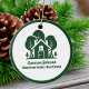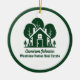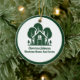 Esta compañía de propiedades forestales regalo de adorno navideño es perfectamente personalizado para un inmobiliario que tiene una casa abierta cerca de la selva o los bosques. La silueta verde de los árboles detrás de una cabaña de troncos y personalizada con su agente y nombre de negocio de la propiedad para el marketing en los bosques de fondo.