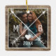Navidades únicos, clásicos, de moda, rústicos y decorativos adornos de árboles de vacaciones, con Feliz Festividad y una alegre cita de texto de Año Nuevo, y espacio para personalizar o personalización con una foto y nombres (o nombre de familia) de su elección en una rústica casa de campo estilo casa de campo de textura de tablas de madera templada.