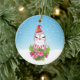 El adorno navideño con un diseño tierno y caprichoso, con un adorable pingüino vestido con un sombrero rojo de santa. Detrás de un ramo de flores con caramelos de rayas rosas y blancas. Un invierno nevado con copos de nieve cayendo.