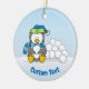 Un pequeño personalizado de pingüino sentado y sosteniendo una bola de nieve. Texto personalizado en ambos lados.