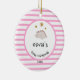 Elegante, moderno y lindo ornamento de fotos de bebé de Navidad con un patrón de rayas rosas. Esta plantilla presenta un adorable ilustracion de un bebé dinosaurio rosado durmiendo bajo las estrellas doradas amarillas con el nombre del personalizado Baby. Revertir para revelar una hermosa foto de un bebé en un marco de círculo de rayas rojas. Genial tanto para el niño como para el chica. ¡Un regalo perfecto para todas las temporadas!