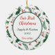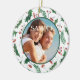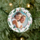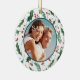 En este adorno temático de "Primera Navidad", su propia fotografía se coloca dentro de un marco circular de hoja verde y berry roja. La parte posterior del adorno tiene el mismo fondo y círculo con el texto personalizado en color rojo y verde. Hay cuatro campos de texto, así que puedes hacer que diga lo que quieras.