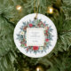 This beautiful ornament features a lovely watercolor style holiday wreath with green pine leaves and branches, red Christmas berries, pine cones, and red and cream colored flowers.. A square frame with a faux gold border is in the center, and you can personalize with your baby's name and any message or year by using the template.