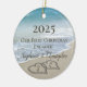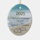 Año, nombres e iniciales. Celebre su compromiso mientras planea una boda en la playa o luna de miel con este adorno de compromiso conmemorativo. Corazones entrelazados de boda en la playa dibujados en la arena hacen un tema náutico costero tropical del océano elegante o regalo de compromiso de boda de crucero. Hermosas olas de agua turquesa chocando en la orilla y cielo azul pastel.