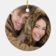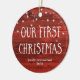 Este ornamento rústico del estilo ofrece una mirada de madera roja con nieve que cae hivernal, y las palabras "nuestro primer navidad" en la tipografía moderna blanca. Añada sus nombres y año al frente, y personalice la parte posterior añadiendo su foto preferida de los dos de usted.
