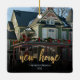 Conmemorar su primera Navidad en su nuevo hogar con este hermoso adorno de keepsake moderno. El texto dice "Primera Navidad en nuestro nuevo hogar", con las palabras "nuevo hogar" en elegante escritura de Relieve metalizado de imitación de oro. Reemplace la imagen de ejemplo con una foto de su casa nueva y agregue el apellido de su familia en letra blanca sans serif. Un filtro de degradado oscuro ayuda a hacer que el texto aparezca.