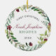 Este elegante adorno de dos caras de fotos de vacaciones contiene una foto de un recién nacido de su bebé enmarcado por una floral cortina de vegetación de las vacaciones de acuarela. El dorso del adorno incluye la frase "Primera Navidad" con texto personalizado que puede personalizarse con el nombre completo del bebé y el año de su nacimiento. Incluye una magnífica paleta de invierno de color burdeos/vino tinto, merlot, gris oscuro y tonos verdes.