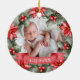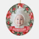 Primer Ornamento Cerámico de Fotograma Floral Clásico de Navidad para bebés. Celebra la alegría de la primera Navidad de tu bebé con este adorno de dos fotos, bellamente diseñado y personalizado, enmarcado por una clásica poinsettia de acuarela y corona eterna en ambos lados. Cada lado incluye un cartel rojo festivo en la parte inferior, que le da un toque encantador. La parte delantera incluye el nombre de su bebé y el año, mientras que la parte posterior muestra el año en un tamaño mayor, lo que lo convierte en un recuerdo eterno. Perfecto para exhibir una preciada foto de su bebé, un momento dulce con los padres o una foto familiar, este adorno trae un toque festivo, tradicional con ricos detalles rojos y verdes. Ideal como un regalo sincero para los padres o abuelos nuevos, este conservador personalizado celebra una primera temporada de vacaciones memorable con estilo.